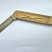 Vends, pour collectionneur, ancien couteau pliant COURSOLLE fabriqué en France, à Thiers. - manche en laiton de 10,5 cm de long, à décor sportif finement ciselé , joueur de basket d'un côté, de tennis de l'autre. - une lame de 8 cm en acier - poids 66 g Très bon état envoi pour 3 €