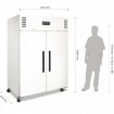 Armoire réfrigérée 2 portes sur roulettes de couleur laquée blanc, avec contrôleur électronique et affichage digital LED de la température. Dégivrage automatique. Idéale pour conserver tous vos aliments au frais. Il y a 6 étagères réglables incluses et 1 protection de sol. Ce réfrigérateur professionnel possède un compresseur puissant pour un refroidissement rapide. Vous pourrez ainsi stocker tous vos produits frais sans rompre la chaine du froid. Les professionnels de la restauration l'apprécient particulièrement.