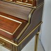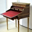 Élégant bureau « Bonheur du Jour » dans le style de Louis XVI. richement orné de filets, baguettes et plaques de laiton strié. Son dessus, en marbre rose des Pyrénées, est entouré d'une galerie en laiton ajouré. Il ouvre par 3 petits tiroirs sous le marbre, suivi d'un cylindre composé de baguettes demi-rondes en acajou massif et soulignées d'un fin filet de laiton. Son ouverture est à système : c'est le tiroir du bas, qui est doté d'une serrure et qui ferme à clé qui, en s'ouvrant, conditionne l'ouverture du cylindre. A l'intérieur du cylindre on découvre un petit compartiment et un casier pour les plumes d'écriture et deux casiers à encriers (manquants) , ainsi que 3 tiroirs. L'abattant se déplie, découvrant un plan d'écriture incliné mesurant 71cm X 47cm, 80 cm x 50 cm hauteur total : 110 cm hauteur écritoire 71 cm . recouvert d'un feutre bordeaux d'origine. Il repose sur 4 pieds fuselés à cannelures, bagués de bronze en partie haute et se terminant par des sabots de bronze. Construction réfléchie et solide . Époque : milieu du XIXe. Livraison toute La France tél :07 65 18 14 70