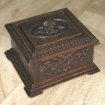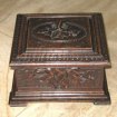 Vends ancien Coffret à Cigares en bois sculpté. Il doit dater du début du XXe siècle. Dimensions maximum : Largeur = 23,5 cm ; Profondeur = 21,5 cm ; Hauteur (en comptant le motif de couvercle) = environ 16,5 cm. Ce coffret est en assez bon état d'usage : des trous d'insectes sont néanmoins présents dans le bas de la boiserie. Il comporte une serrure en façade, mais je ne possède pas la clef.