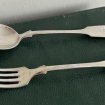 Ensemble de 12 COUVERTS A RAGOÛT métal maillechort argenté, composé de 6 cuillères et 6 fourchettes monogrammées (voir photo), gravées CBS90 (voir photo). CUILLERE : poids 58 gr, longueur 22 cm FOURCHETTE : poids 52 gr, longueur 21,5 cm Bon état, rayures d'usages, écrin d'origine un peu défraîchi dû à l'âge. Port en sus