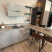 Cuisine d'exposition DISCAC modèle effet béton taloché Implantation en U de dimensions 2270 x 2670 x 1580 cm Très bon état Vendue démontée et filmée sans électroménager