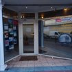 Modèle 1 : vitrine de commerce alu laqué blanc PVC de forme trapézoïdale Hauteur 262 cm Largeur totale 340 cm, composée de 3 panneaux de 219 + 103 (bloc-porte) + 128 cm Ouverture du bloc-porte 82 x 207,5 cm 800 € HT
