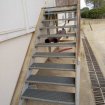Escalier de service métallique caillebotis Boulonné au sol Longueur total 400 cm Hauteur 186 cm Largueur 102 cm (115 cm de largeur hors tout avec poteau latéral et garde corps) Hauteur garde corps 105 cm