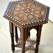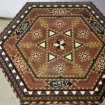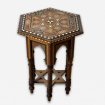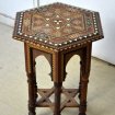 Petit guéridon octogonal oriental en marqueterie de bois noirci, bois clair et nacre, à décor de damiers sur le piètement, et de chevrons sur le plateau entourant un motif floral arabisant central, d'époque début XXème siècles. diamètre 33 cm hauteur 60 cm. Livraison toute la France. tél : 07 65 18 14 70