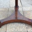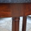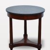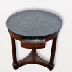 Grand Guéridon style Empire en acajou massif et placage d'acajou XIXᵉ, avec tiroir reposant sur 3 colonnes posées sur une entretoise à flancs concaves. Dessus de marbre granité noir et colonnes cerclées haut et bas. Dimensions au marbre : diamètre 66 cm - hauteur 71 cm Parfait état. Livraison en France