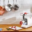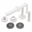 Hachoir à viande semi-pro fourni avec 3 disques épais moyen et fin. Il possède une fonction marche arrière pour les viandes difficiles. Fourni avec accessoires de poussoir à saucisses.