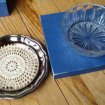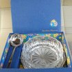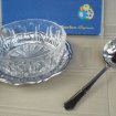 Bel ensemble du siècle dernier coupe saladier aspect cristal + louche + plateau en inox dans leur coffret d'origine. Saladier : diamètre 21cm. Plateau : diamètre 24cm. Bien pratique pour servir votre salade de fruits ou faire une coupe de fruits ! A offrir ou à s'offrir ! Le prix est celui du lot non divisible, c'est celui de la photo. Envoi possible, poids 1.6Kg. Annonce visible = produit disponible.