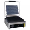 Grill à panini, structure en acier inox. Gril 2 plaques rainurées Chauffe rapidement Armature anti-rayure Bac récupérateur amovible Dimensions 210(h)x 360(l) x 320(p)mm Surface de cuisson 310x250mm Puissance 2 kW, 8.7A, Monophasé Alimentation 230V