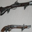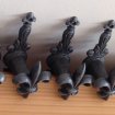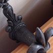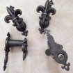Lot de 4 PATERES, Porte pistolets, Fleur de lys, façon étain,pour décor mural, la fleur de lys s'étire grâce à un système de ressort rétractable qui maintient le pistolet, écart minimum là où on pose le pistolet 3 cm, maximum 5 cm, hauteur mural 10 cm, hauteur fleur de lys avant 6 cm, vendu avec visses. (Voir photo pistoles posés) 20 € la paire Port en sus