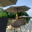 Grande terrasse extérieure aménagée avec Bimini, salon de jardin, coffre et parasols.