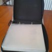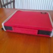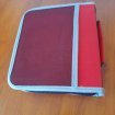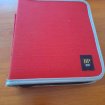 Pochette de rangement carte , cd , dvd En tissus couleur rouge Fermeture par Zip , une poche extérieur et une poignée Dimension : 20 x 23,5 cm Epaisseur : 4 cm Contient 17 pochettes Plastifiées soit 34 rangements Possibilité de rajouter des pochette par ouverture de œillets type classeur Bon état Envoi possible