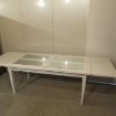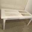 Table originale, avec ses deux rallonges latérales et son centre , façon persienne, protégé par une vitre amovible. Peinte en blanche, avec des effets d'usure, le bois est du tilleuil, ses dimensions : Hauteur : 76 cm Largeur : 95 cm Longueur : 180 cm + 2 X 45 cm soit en tout : 270 cm