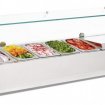 Dimensions 435(H) x 1200(L) x 330(P)mm Plage de Température : +2 à +8 °C Parois en verre Refroidissement statique Dégivrage en continu par évaporation Indicateur digital de température et commande facilement accessible Capacité 5 x GN 1/4 de 100 mm de profondeur maximum (Bacs vendus séparément) Puissance 150 W - 230V - 1A Poids : 49 kg